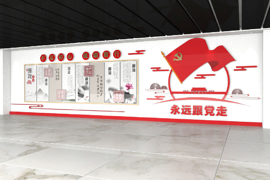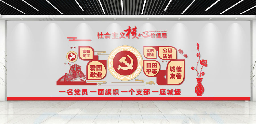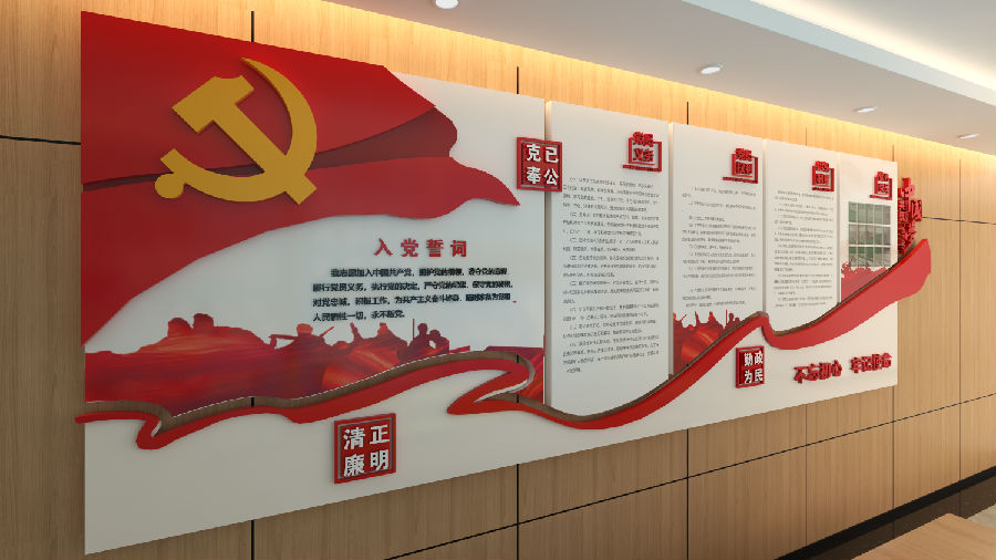 党建文化墙适用于比较大的前厅,进行政务公开、党务公开的政策宣传地方使用。通过文化墙推广宣传,借墙接稳地气,装点了企业文化环境,进一步提升基层党建的文化内涵,使广大党员职工在浓厚的文化氛围中增长知识,提振精神,凝聚合力,坚定信心永远跟党走。