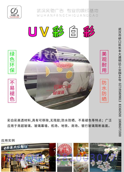 彩白彩是一种超透玻璃贴,属于UV喷绘的一种,色彩靓丽丰富、耐磨损、防紫外线。UV喷绘使用的油墨有着更高的耐候、耐溶剂性能、饱和度高,因此画面清晰细腻、色彩鲜艳。UV喷绘采用分层打印技术,可实现一次性白色和彩色喷画。透明膜(磨砂贴、透明胶片、PVC膜等)白色铺啊底彩印,彩白彩双面颜色彩印,增加色彩鲜艳度,让图案更有立体感。